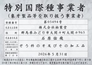 象牙の正規取扱販売業者として登録されています。【特定国際種事業者(象牙取扱許可番号) 第05494号】